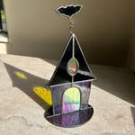 A spooky bat house adorned with a tiny bat flying above! Translucent iridescent yellow was used for the window and doorway, and an opaque black and purple glass were used for the rest of the house. It sits reinforced atop a purple vangogh glass base.