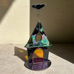 A spooky bat house adorned with a tiny bat flying above! Translucent amber orange was used for the window and doorway, and an opaque black and iridescent black glass were used for the rest of the house. It sits reinforced atop a purple vangogh glass base.