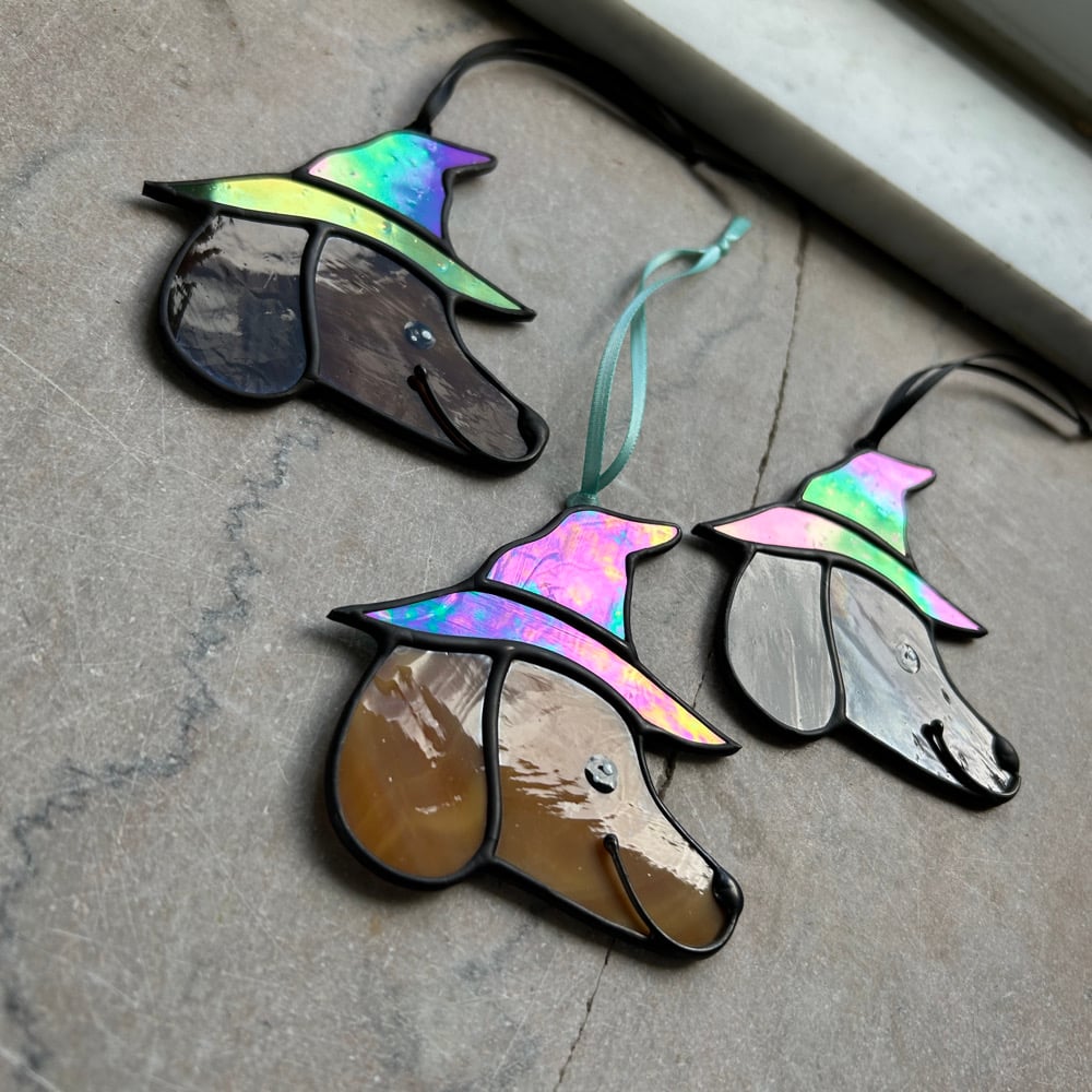 Two are opaque brown with dark iridescent hats, and one is a chestnut brown with an iridescent teal hat. Painted details and wirework are included for the face.