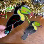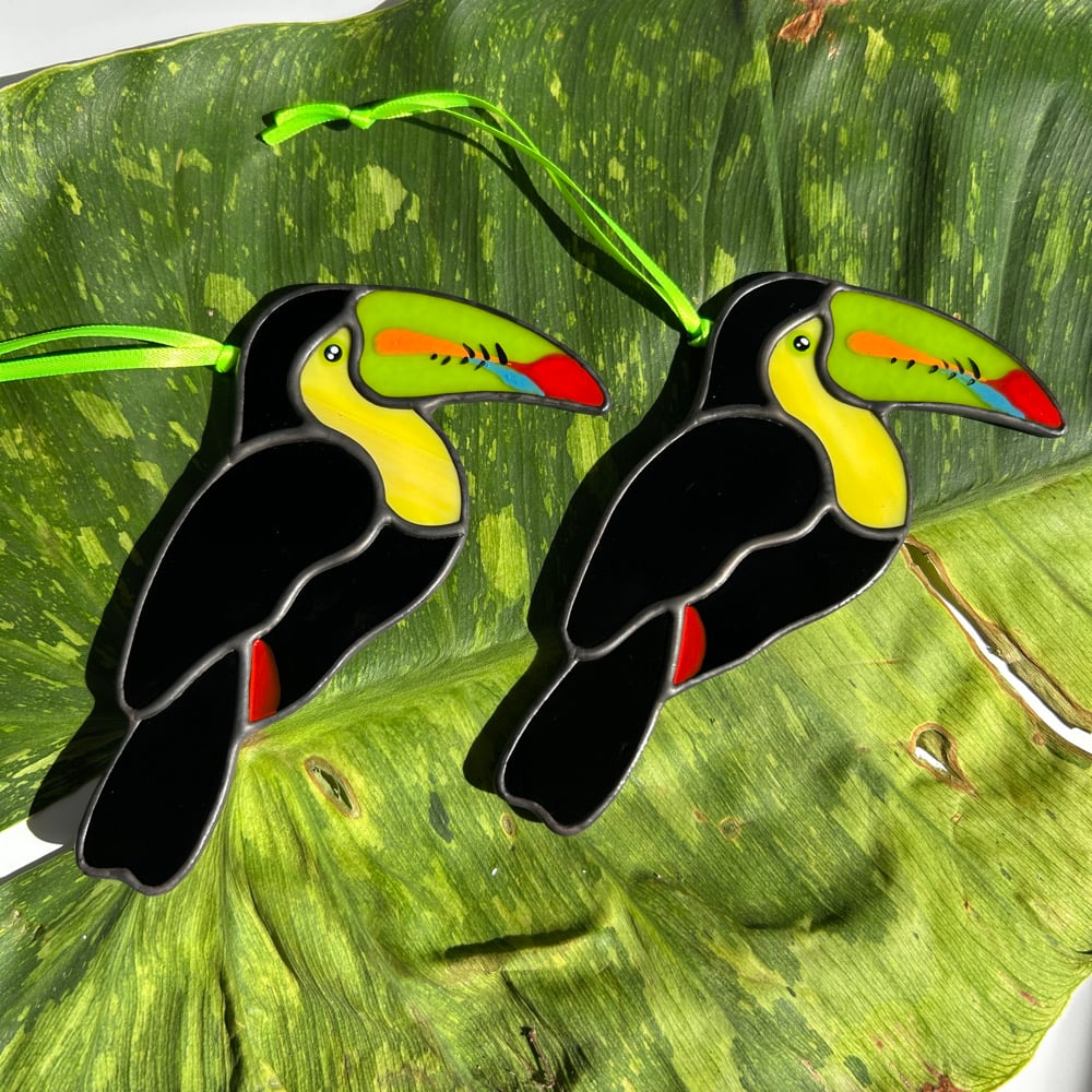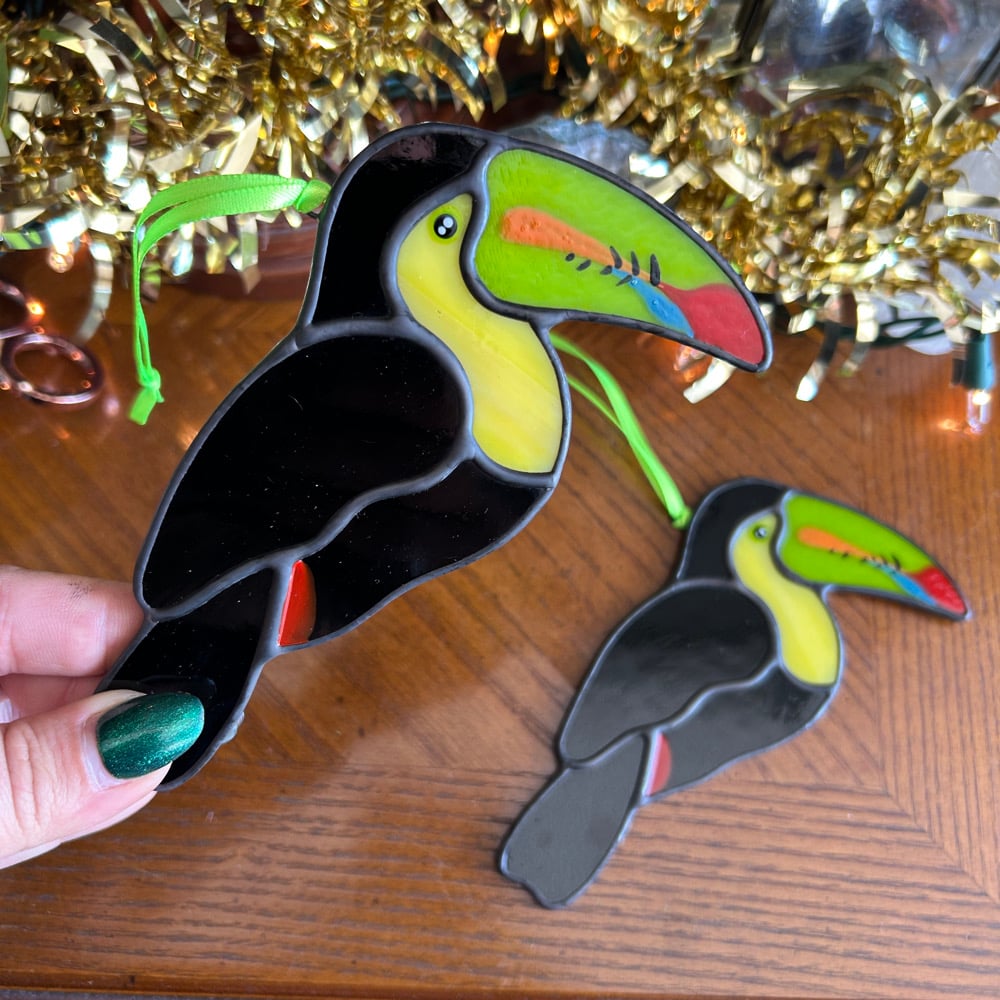 Adorable little toucans with their prominent colorful beaks!! Opaque black glass was used for the body to contrast against those vibrant shades. Hand painted markings on the beak :)