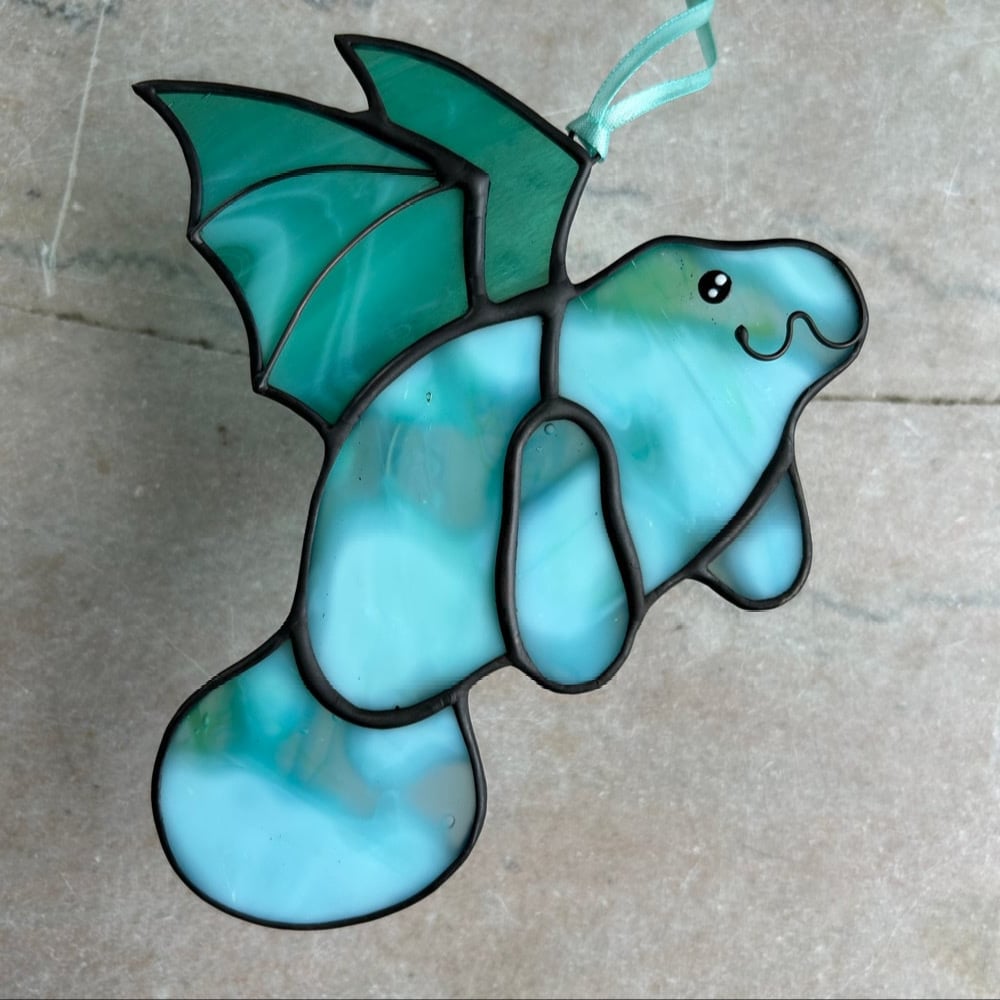 Our favorite Floridians are dressed up for the season! An aqua mottled glass was used for the body, and the wings are a streaky translucent teal. Wire work was used for the face and wing details.