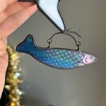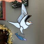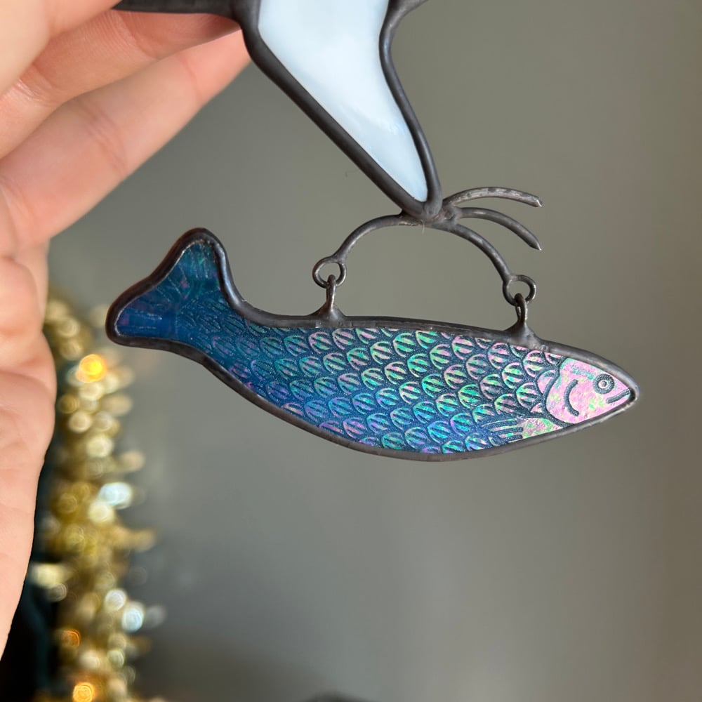 Inspired by watching ospreys dive for their pray, I’ve designed this one with a laser engraved fish that wiggles in the breeze! The face details are hand painted. White glass was used for the body, and a dark brown for the upper wing. The streaky glass mimics the feathers you might see on the underwing.