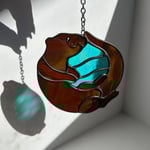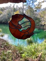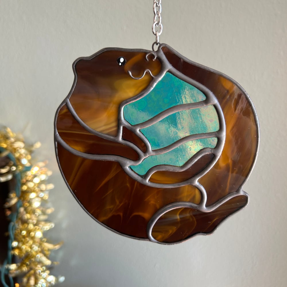 One of the coolest animals to see in our local waterways - the North American River Otter glides and loops effortlessly like an aquatic acrobat! These are accented with an iridescent teal glass in the center, representing fresh spring water. Wirework was added for the mouth and nose, and an eye was painted on by hand.