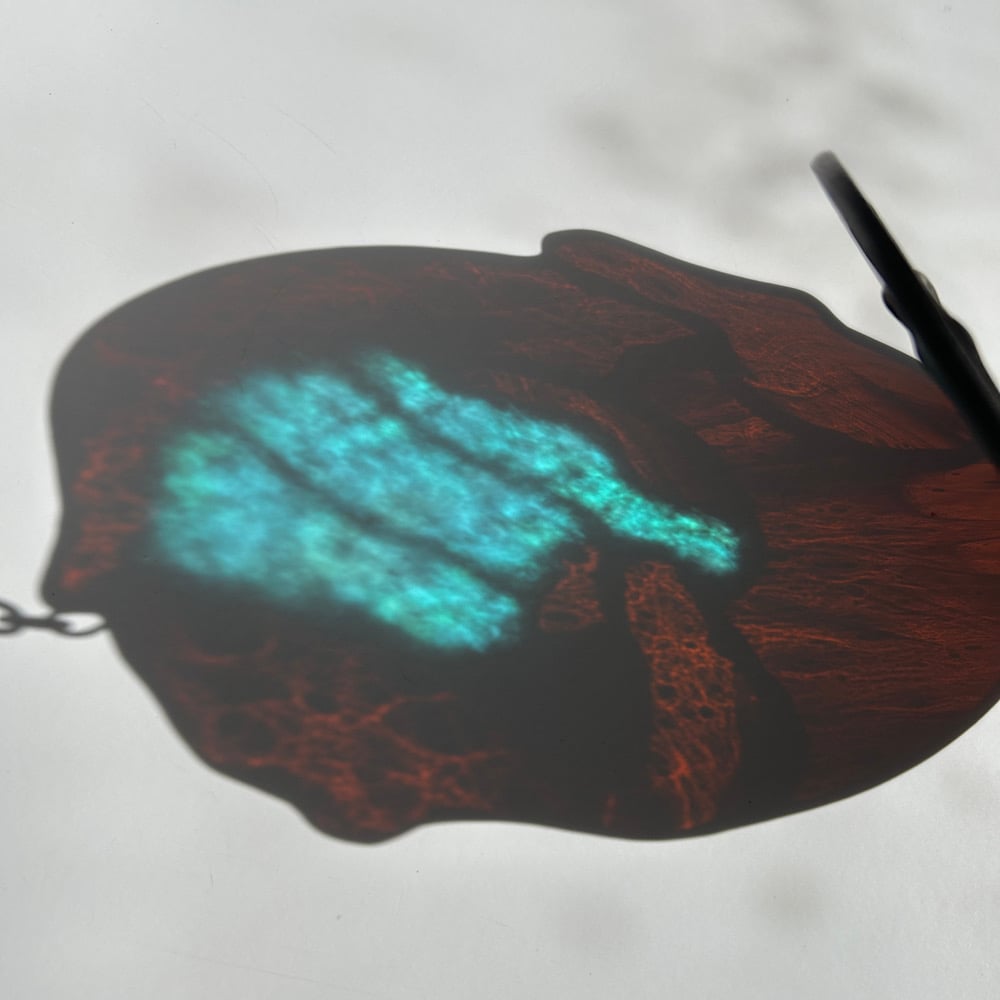 Measures 5 x 4.5 inches and includes a chain to hang from.