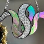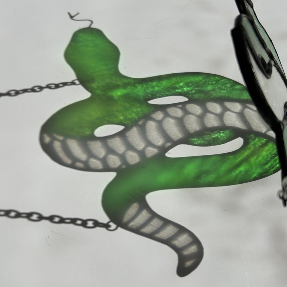 An iridescent emerald green snake with REAL snake shed pressed between two layers of glass!