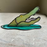 My standing gator design sits atop an iridescent teal base, which mimics the water of the Florida swamps and springs. The teeth are meticulously crafted to be 3D & I've even painted a yellow eye using enamel paints.