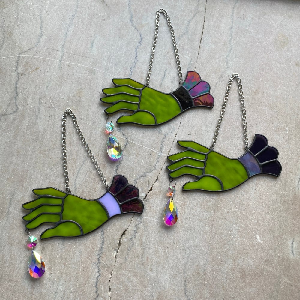 A lime mottled green appears to me as zombie skin! I used it for these hands featuring a Victorian cuff - in hues of purple and interesting textures. A colorful crystal hangs from the fingers as well, sending rainbows all over the room when it’s hit by the sun!